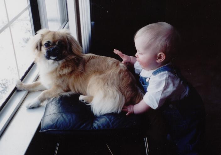 Vilma, på bilden 8 månader, klappar Cajsa (Kangris Cajsa Cavat) även hon 8 månader på fotot.